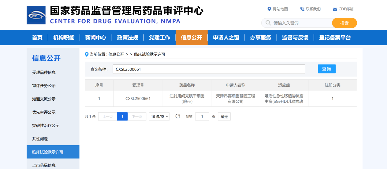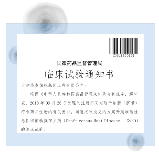 2025年11月3日, 天津昂賽細胞基因工程有限公司申報的注射用間充質(zhì)干細胞(臍帶)治療難治性急性移植物抗宿主病(aGvHD)兒童患者的適應癥獲得國家藥品監(jiān)督管理局臨床試驗默示許可
